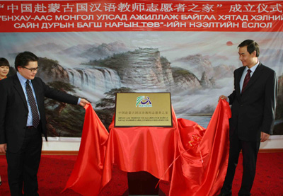 最后,王?蹬c道力鋼共同為“中國赴蒙古國漢語教師志愿者之家”揭牌。