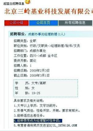 2月4日上午10時許,《史上最牛招聘啟事,可是正規發布的哦!》這個帖子在天涯社區迅速引起關注。發帖者網友“木鼠”稱在成都招聘網上發現一條招聘經理助理的啟事,其中竟有“能夠接受成為經理暫時性伴侶”這樣的字眼。