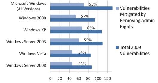 報告稱,取消Windows 7管理員權限,去年發現的全部Office漏洞都可以被避免,94%的IE漏洞可以避免,100%的IE 8漏洞可以避免,64%的所有微軟產品漏洞可以避免。