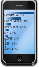 報告顯示,目前從活躍用戶的市場占比情況來看,UCWEB用戶優勢仍較為明顯,三季度約占活躍用戶總數的61.33%,Opera Mini活躍用戶數位居第二,約占活躍用戶總數的25.22%,此外,空中Opera約占總活躍用戶數的8.38%。但3G門戶、騰訊等廠商通過增加產品的適配性,紛紛發力手機瀏覽器市場,利用原已積累的龐大的用戶群搶占了部分用戶界面。