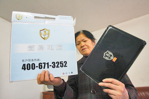 昨日,記者在大坪金銀街的湯大媽家里看到了這臺上網(wǎng)本。包裹上顯示的是由江蘇昆山市物流公司遞送的“10寸黑簡易電腦+蘋果手機+DC”,沒有發(fā)貨的公司名稱,只留有電話號碼400-671-3252。這臺黑色的上網(wǎng)本是塑料外殼,很輕很薄,沒有產(chǎn)品名稱,外面蓋上有“簡易電腦”幾個字,側(cè)邊有幾個USB 接口。