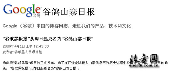 同時,為慶祝“谷鴿鳥看”項目的正式發(fā)布,谷歌中國的官方博客“谷歌黑板報”也在今日“撰文宣布“改名”為“谷鴿山寨日報”。該博客稱:“為了在打造全球最大山寨信息網(wǎng)的歷史進程中扮演好宣傳隊、鑼鼓手的角色,‘谷歌黑板報’從即日起更名為‘谷鴿山寨日報’”。但記者注意到,該日志的發(fā)布者署名為“谷歌愚人節(jié)項目組”,想必“谷鴿鳥看”和“谷鴿山寨日報”的改名行動都是今天這個特殊節(jié)日的一部分。