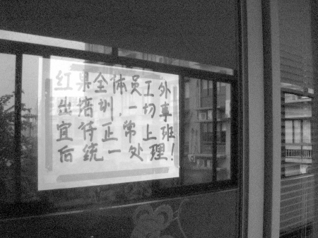 門上貼著一張告示,“紅果全體員工外出培訓,一切事宜待正常上班后統(tǒng)一處理”。記者透過玻璃看到,該公司的辦公用品還在。