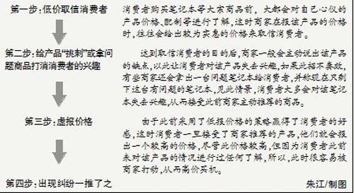 在中關村發生的大多數價格欺詐,都有著一種固定的套路。林漢鐘把這種欺騙手法歸結為“四步”。