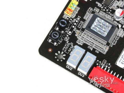 富士康FLAMING BLADE提供了電源、重啟按鈕和D-BUG指示燈,方便玩家在打開機箱進行調試的時候開關機、重啟和排除系統故障。