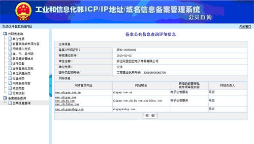 記者同時(shí)在工信部域名備案系統(tǒng)查詢(xún)發(fā)現(xiàn),相關(guān)域名已經(jīng)于2010年2月2日通過(guò)審核,申報(bào)單位為浙江阿里巴巴電子商務(wù)有限公司,且域名所匹配的ICP證號(hào)正是目前支付寶所使用的ICP證號(hào)。