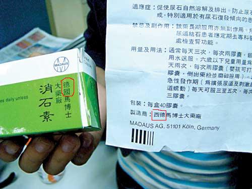 17日上午,記者看到“消石素”的藥盒上寫有“德國馬博士大藥廠”字樣,而說明書上標的制造商,卻是“西德馬博士大藥廠”。就是“德國”與“西德”這點差別,讓李先生對藥品的真實性產生了懷疑。李先生認為,東德與西德早就統一,哪里既有德國,又有西德呢?