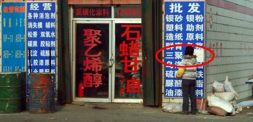 記者在一家化工店招牌上發現三聚氰胺字樣,老板解釋現在早都沒賣了