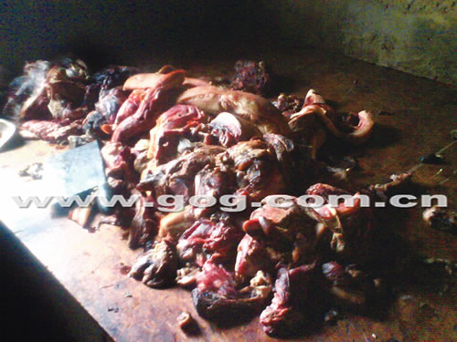 記者昨日(1月13日)在現場看到,一間不大的瓦房內掛滿了熏制好的臘肉,約有百余條,地上還有很多松枝燃燒后剩下的灰燼,此臘肉外觀的顏色和市場上所賣的正規臘肉差不多,但仔細辨認會發現其還有很多豬毛沒有完全剃掉。緊挨著該加工房的是一間大一點的屋子,其為初加工房,剛走近該屋記者立刻聞到一股酸臭味,制作臘肉的原材料隨意的丟棄在水泥地上,而且部分豬肉已經變色發臭。該屋里還擺放有幾個盆和大桶,里面存放的黑色液體估計是用來腌泡臘肉的醬汁。
