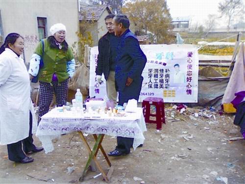 7日,記者現(xiàn)場看到,一個用白桌布鋪好的小桌上擺著牙具模型、補牙、脫脂棉、酒精等治牙工具,兩個破舊的牙具模型上黑色污垢清晰可見,所有工具包括酒精均只看到膠布貼的標(biāo)識,旁邊是兩把塑料椅,3只杯子,四五瓶藥和六七把拔鉗。大幅宣傳畫靠在路邊的垃圾堆上,一名老人剛看完牙正遞給“牙醫(yī)”10元錢。