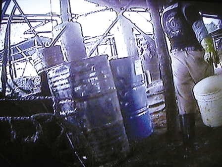 昨天下午,羊城晚報記者以收購“潲水油”為名,進入該家煉油窩點。從泰龍工業園附近的一條小路拐入,穿過鐵路涵洞不到100米即到,門口以竹柵欄做門,未見廠名或掛任何招牌,卻用木桿高高掛起一個油桶。人一走近門口,一陣難聞的餿臭味便迎面撲來,入門左側堆放了幾十個空油桶,還有一堆堆榨剩的油渣。場內中央并排連著十幾個大水泥池,池內裝填有大量剩飯剩菜等食品垃圾,空氣里彌漫著惡臭,令人掩鼻;再往里走,是一架帶有發動機的簡陋榨油機,機器轟鳴聲中,不斷有深黃色的油液被擠出,滴到榨油機下方的一個槽里;旁邊還有幾個貌似用作煮油的圓筒裝置,周圍油污滿地。記者現場看到,場內沒有一間固定建筑,全是用木頭、鎂瓦搭建起來的粗陋臨時棚寮。