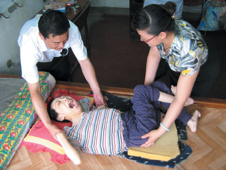 噩耗傳回村里后,大家本以為董英杰兩口子會放棄這個孩子,任她自生自滅,沒想到堅強的董英杰下定決心,一定要養活女兒。因為女兒沒有咀嚼能力,吞咽功能也近乎喪失,除了每天照顧女兒大小便外,女兒所吃的每一口飯,都是由她在自己嘴里一口一口嚼好,然后用舌頭把飯一口一口送進女兒嘴里,幫助她吞咽下去。村民們都說,這樣喂飯一口兩口容易,21年如一日,除了董英杰恐怕很少有人能堅持下來。董英杰寬厚的母愛不但感動了整個村子,連智力嚴重殘疾的女兒都被她感動了,穎欣認識母親,并能通過眼神與母親交流。