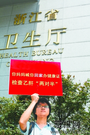 上網(wǎng)查詢乙肝相關(guān)資料后,雷闖更是驚訝地發(fā)現(xiàn),全國上億名乙肝病毒攜帶者都遭受著歧視。雷闖告訴記者,其實早在2003年,他所在的浙江大學(xué)一名大四學(xué)生周某,在考取公務(wù)員后,卻因為乙肝病毒攜帶者的身份而被拒之門外。
