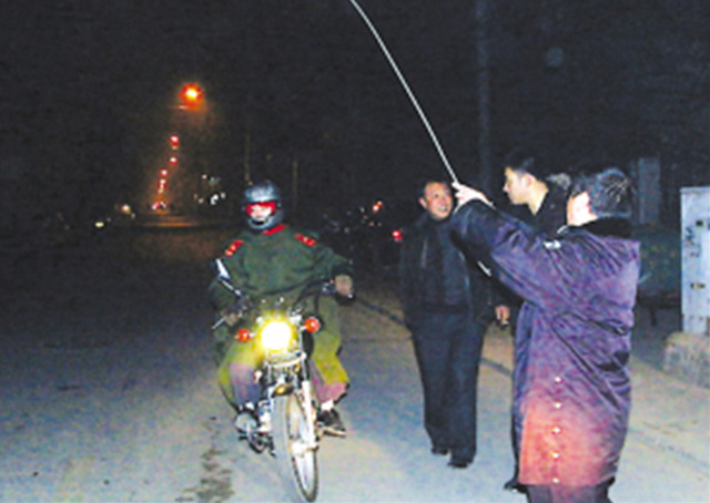 民警告訴記者,這根纜線已經(jīng)放倒幾位行人,其中受傷嚴(yán)重的潘女士脖子被“勒”了,剛?cè)メt(yī)院。記者發(fā)現(xiàn),每當(dāng)有電動(dòng)車或摩托車經(jīng)過這里時(shí),民警都會(huì)將這根纜線舉起來,讓大家鉆行。民警表示,他們已經(jīng)通知相關(guān)部門前來查看到底是哪家的通訊電纜。
