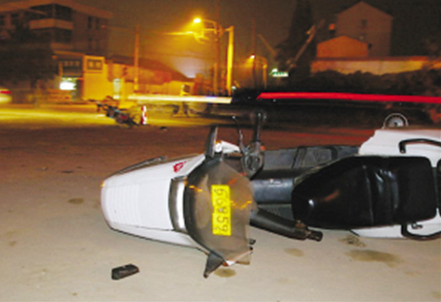 記者當(dāng)晚趕到現(xiàn)場(chǎng)時(shí),潘女士已去醫(yī)院就診,一名腿部受傷的男子正坐在路邊休息。只見地上躺著一輛電動(dòng)車和一輛摩托車,電動(dòng)車旁邊已被接警前來的派出所民警放置了一個(gè)警示標(biāo)志,民警同時(shí)還將警燈打開,提醒過往的電動(dòng)車和摩托車減速行駛。