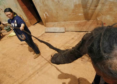 老人說,從她10歲那年起,她就開始養這辮子了。開始的時候辮子只有一尺長,她一天要梳幾次,也經常洗。但頭發漸漸長了,實在難以梳洗,她就干脆不梳頭少洗發,原來3天洗一次已經很難受了,后來又逐漸變成一個星期、10天,有時甚至半個月才洗一次頭。一轉眼,她這長辮子已養了50年,她也有40年沒梳過頭了。現在,劉老太的辮子與其說是一根辮子,不如說是一根雜草編織的“手臂”。