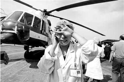 昨天下午4點(diǎn)05分,東方通用航空公司的一架米1-71直升機(jī)緩緩降落在廣漢機(jī)場(chǎng)停機(jī)坪上。艙門打開,40歲的女護(hù)士杜娟下了飛機(jī),招呼著成都120急救中心的醫(yī)護(hù)人員將傷員抬到急救車上。杜娟是北川縣禹里羌族鄉(xiāng)衛(wèi)生院的護(hù)士。5·12地震后,禹里與世隔絕,直到昨天才等到直升機(jī)將重傷者送出。杜娟隨機(jī)照顧患者。傷員都下了飛機(jī)后,杜娟向于波借手機(jī),電話打通時(shí),她手開始顫抖,撕心裂肺的哭聲終于無(wú)法忍住。那是她六天后,第一次給外面的親人打電話。巨大的螺旋槳轉(zhuǎn)動(dòng)聲中,人們只能依稀聽到她的哭訴:“我要去找他,不能連個(gè)尸體都沒(méi)有。”于波默默地看著她,不到一個(gè)小時(shí)前,他還覺(jué)得這個(gè)女護(hù)士嚴(yán)厲得有點(diǎn)過(guò)分。