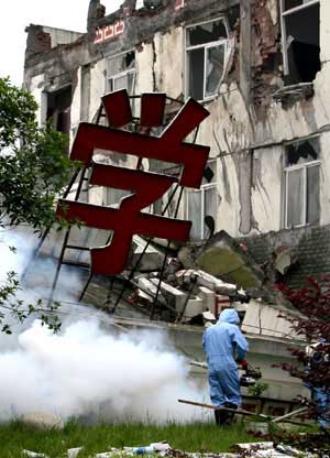 5月18日,防疫人員在映秀鎮一處學校的廢墟上噴灑消毒水。