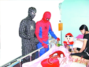 昨日上午9時30分許,在汕頭大學(xué)第一附屬醫(yī)院北樓三層的兒科病房的走廊上,突然出現(xiàn)了兩個與周圍環(huán)境不太相襯的角色,立刻引起了一陣不小的轟動。“兩個男的,一個穿紅衣服,一個穿黑衣服,都蒙著臉。”兒科病房42床上的小患者母親黃海璇回憶當(dāng)時的情景,這兩個人的裝扮就和電影里的“蜘蛛俠”一模一樣,徑直來到了她眼前,然后把蜘蛛俠玩具放到了病床上。