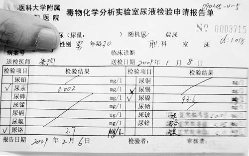 當時正患重度蕁麻疹的他,在看帖子的當天就到醫(yī)院打麻藥拔掉了3顆烤瓷牙。第二天,又專門請假到朝陽醫(yī)院做尿鎳測試。幾天后,他拿到了一份讓他“一下子懵了”的報告單,單子上顯示:他尿液中的鎳含量為144個單位!