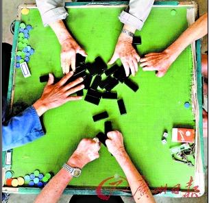 下午1時多,馬曲頭還沒有開始生火煮粥,而不遠(yuǎn)處則傳來麻將的聲音,那里是個娛樂室,面積不大,只有10多個平方米,擺了兩桌麻將,一桌牌九。推牌九的其中一位老人已90歲了,但他氣色不錯,頭腦也清醒。4個老人用殘破的雙手玩牌。