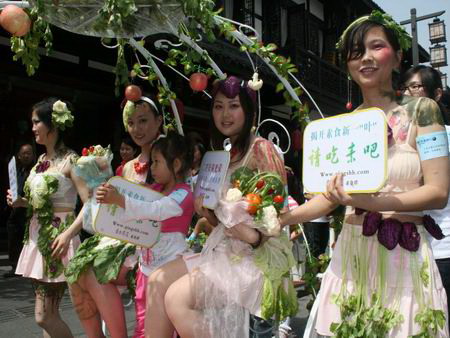 將各種蔬菜葉子披在身上,4月19日一幫坐著花車的美女突然現身成都文殊坊街區,身著清涼的她們著實有人氣:不但沿途路人紛紛掏出手機拍照,甚至很多市民一路追著看鬧熱……四川新聞網記者從主辦單位獲悉,美女們此舉目的是為了倡導素食主義。
