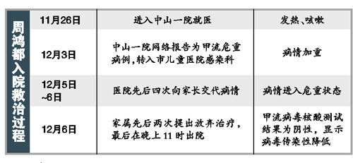 兒童醫院副院長龔四堂稱,入院時周鴻都呼吸急促、血氧飽和量低、心率快、反應差,當時就上了呼吸機,并且接受抗感染、糾正貧血等治療,入院的初步診斷是甲流、急性支氣管肺炎、呼吸衰竭、血小板減少性紫癜。到了第二天,他在呼吸機幫助下血氧飽和度已經維持到正常水平,胸片顯示肺部大片感染,給予達菲等藥物治療。到了12月5日、6日兩天,他的病情進入危重狀態。根據通報,在12月6日,周鴻都的家屬共10多人來到醫院,先后兩次提出放棄治療,自動出院。