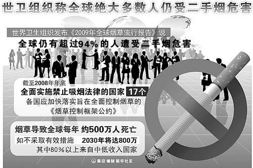 2008年10月30日,來自全國的400家環(huán)保民間組織的代表在北京發(fā)出共同聲音:吸煙是污染環(huán)境的行為,應當維護被動吸煙者、維護環(huán)境的合法權益。他們呼吁盡快制定并頒布控煙特別是公共場所禁煙的法律、法規(guī),并有效監(jiān)督實施。根據(jù)中華環(huán)保聯(lián)合會《被動吸煙的調查問卷報告》,85%的受調查公眾不清楚被動吸煙對人體健康造成危害的嚴重性。而目前,我國的吸煙人數(shù)達到3.5億,被動吸煙人數(shù)高達5.4億。我國于2003年11月10日簽署了世界衛(wèi)生組織的《煙草控制框架公約》,2006年1月9日,該《公約》在我國生效。