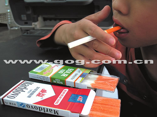記者看見,劉女士從兒子那里收繳的某品牌的酸酸糖是廣東一家食品廠生產的,從外包裝看,它就像一包香煙,每盒5支裝,每一支酸酸糖乍一看與一支香煙沒有區別,過濾嘴是用黃色色素染出來的。