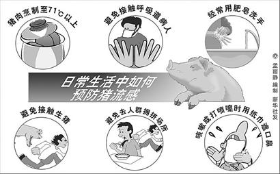 避免接觸流感樣癥狀(發(fā)熱,咳嗽,流涕等)或肺炎等呼吸道病人;注意個(gè)人衛(wèi)生,經(jīng)常使用肥皂和清水洗手,尤其在咳嗽或打噴嚏后;避免接觸生豬或前往有豬的場(chǎng)所;避免前往人群擁擠場(chǎng)所;咳嗽或打噴嚏時(shí)用紙巾遮住口鼻,然后將紙巾丟進(jìn)垃圾桶;如在境外出現(xiàn)流感樣癥狀(發(fā)熱,咳嗽,流涕等),應(yīng)立即就醫(yī)(就醫(yī)時(shí)應(yīng)戴口罩),并向當(dāng)?shù)毓残l(wèi)生機(jī)構(gòu)和檢驗(yàn)檢疫部門(mén)說(shuō)明。