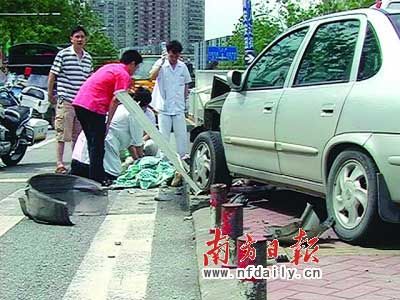 車禍現場對面某玉器檔主稱,當時一名30多歲的孕婦正在安全島靠近交通燈處等候過馬路,這時銀色小轎車失控沖破護欄直奔孕婦。“小轎車急剎都來不及,重重地撞在孕婦身上,連她后面的交通燈柱都撞歪了。她被夾在小車與燈柱之間,滿臉是血。”“孕婦穿著淡黃色衣服,肚子鼓鼓的,估計懷孕七八月了。被撞后她尖叫一聲,還大喊‘這樣都能撞到’,隨后就不省人事。”圍觀的市民說,救護車趕到后,醫護人員將孕婦抬出,當場在地上急救,孕婦的丈夫在旁邊悲傷痛哭。20分鐘后,孕婦被抬上救護車送院。11時左右,小轎車被拖走。