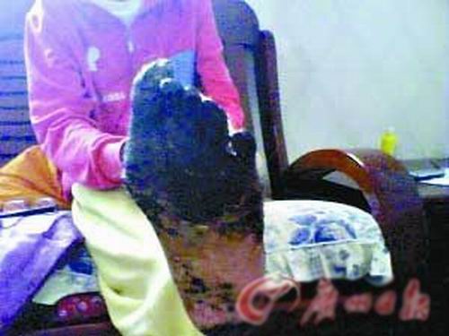 一個28歲的女青年,看起來卻只有十二三歲的樣子,體重只有五六十斤,全身自脖子以下的皮膚有紅有白,一塊一塊的,如同“蛇皮”,好像要脫皮,而且左腳烏黑如同“焦炭”。昨日(11月2日)記者在南方醫院外科樓3樓創傷骨科見到唐麗艷時都不忍心看下去。