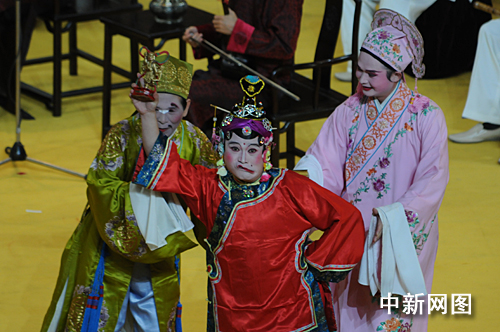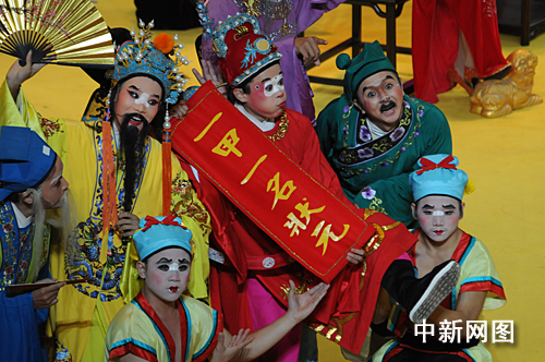 圖為閩南特色節目“南音交響”。南音和梨園戲、莆仙戲、高甲戲等南戲被稱為“閩南活化石”。舞蹈表演薈萃了南戲梅花獎演員和高甲群丑的精湛表演。