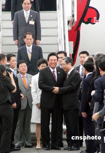 圖為陳云林步出包機(jī),與前來接機(jī)的海基會(huì)常務(wù)副董事長高孔廉握手。