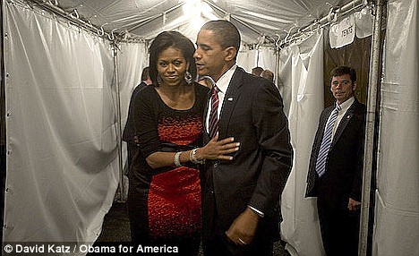 制造歷史前的片刻,奧巴馬在發表勝選講演前與妻子擁抱。