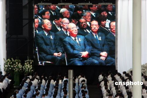 圖為在第二告別分場(chǎng)中央熒幕上正直播主場(chǎng)所的情景,可見(jiàn)有中國(guó)國(guó)民黨主席吳伯雄、親民黨主席宋楚瑜等臺(tái)灣政界人士。