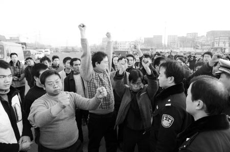 雙方發生第二次撕扯。眼看兩名勸解的民警被淹沒在人群中,立即過來五六名民警才將雙方隔開。