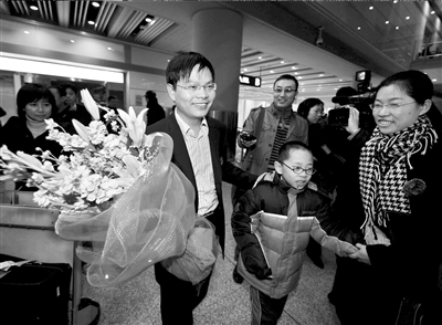 昨日,從泰國返回北京的中國公民黃忠(左二)走出機(jī)場