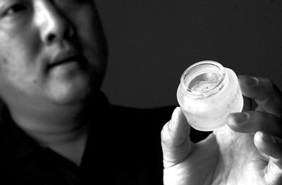在張四林暫住的旅店里,記者看到他帶來的幾件樣品,都是膏、霜類產品。產品的包裝很精美,保質期均到2010年,都沒有拆過封,但是玻璃瓶里的東西都少了幾乎一半。記者打開其中一瓶 “防皺眼喱”,這霜狀的化妝品摸上去已經發硬,挖一點下來涂在手背上,竟搓出一絲一絲的白色物體,根本不能融開。另外一瓶“嫩膚霜”,則幾乎成了塊狀。