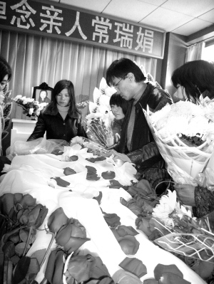 昨天上午9時許,八寶山殯儀館百合廳門前聚集著許多手持菊花的人,他們都是為常瑞娟送別的。隨后,娟子的男友劉貴年帶著娟子的家人走進百合廳。他面容憔悴,嘴唇毫無血色。殯儀廳的中央,娟子靜靜地躺在那里,身穿潔白的婚紗,身上被鮮艷的紅玫瑰花瓣簇擁著。“在她病危的時候,我問她還能堅持嗎?她拉著我的手,用盡全身力氣重重地點了點頭。”儀式上,劉貴年望著女友的臉述說著她的堅強,一直忍著只是哽咽的他突然發出撕心裂肺的哭聲。在他身邊,娟子的父母姐妹早已泣不成聲,在場的人無不流下眼淚。在最后對遺體告別時,劉貴年一直撫摸著娟子的臉。最后一刻,他突然低下頭,深深地吻向女友。