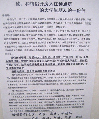 昨天(2月24日),國內知名論壇天涯上,出現了一篇題為《史上最牛的公開信!南京仙林大學城居民致開房同居大學生朋友的一封信!》的帖子。
