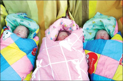 由于家里經(jīng)濟困難,這次直到懷孕5個月時,童芳才在丈夫的陪同下到醫(yī)院做B超檢查,發(fā)現(xiàn)懷的竟是三胞胎。“當時我又開心又擔心,開心的是竟然一次懷了三個,擔心的是怕三個全是女兒。”童芳坦言。