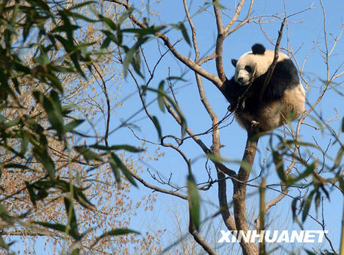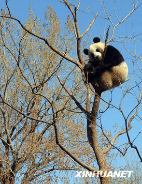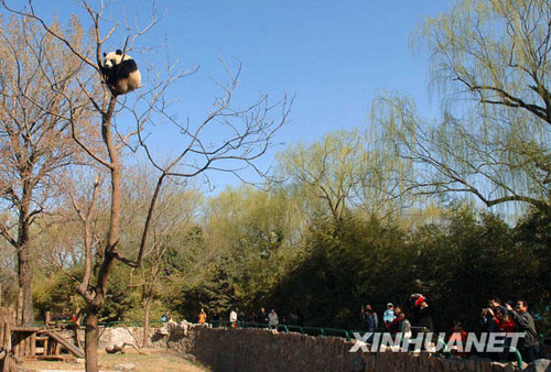 3月22日,北京動物園熊貓館的一只熊貓爬到高高的樹上,它憨態可掬的模樣吸引了很多參觀者駐足觀看。(新華社記者 公磊 攝)