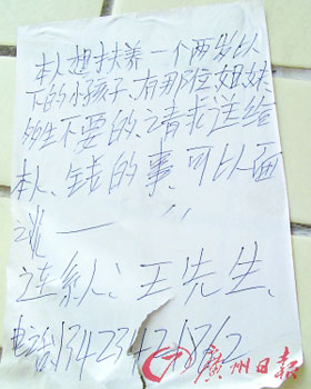 昨日下午,在深圳光明新區(qū)公明辦事處上村社區(qū),記者竟然在一棟樓的墻壁上看見一張買小孩的廣告(見左圖)。這是一張用圓珠筆寫成的廣告,署名為王先生的人稱自己想收養(yǎng)一個兩歲以下的孩子,請有多生孩子的姐妹送給自己一個,價錢可以面談。按照廣告上留的電話,記者撥打過去。接電話的女子稱自己和老公結婚多年未孕,想收養(yǎng)一個孩子,只好寫了小廣告貼在墻上,希望找到合適的孩子。民政部門的負責人表示,這種街頭廣告收養(yǎng)小孩的方式顯然是不合法的,并提醒市民千萬不要上當受騙。(記者 阮曉光攝)