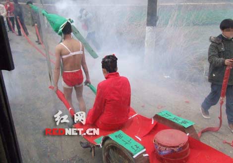 這篇名為《農(nóng)村最驚悚雷人婚禮 模仿“牛頭馬面”》的圖片帖中,一男子拖著架板車,他歪帶著一頂綠色馬頭的帽子,上半身穿著女士的內(nèi)衣,下半身穿著紅色的短褲,全身紅與綠的色彩搭配十分搶眼。而板車上的女士則穿著大紅色的裙子,并無特別,女士身后還放著幾大盒未開封的紅皮鞭炮。看圖片中人們的衣著打扮比較厚實(shí),應(yīng)為冬末春初舉辦的婚禮。