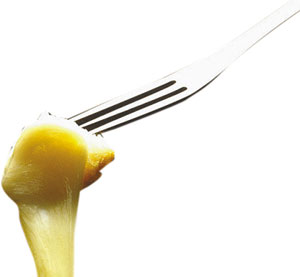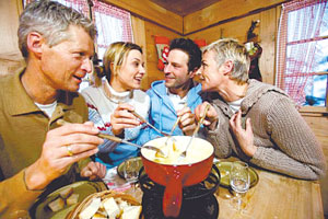 “奶酪火鍋”是瑞士最普遍、最具盛名的火鍋之一。瑞士人制作“奶酪火鍋”一般都是先以蒜涂抹于鍋底,再將不同口味的硬奶酪擦成碎末放入鍋中加熱成糊狀,再加淀粉、白葡萄酒、大蒜、奶油等,繼續(xù)煮并慢慢攪拌至完全融化呈濃濃的煉乳狀,最后放進(jìn)一些黑胡椒即可。上桌后,人們用長柄叉子叉著切成四五厘米見方的“法式長棍面包”蘸著奶酪吃,很像中國的“拔絲香蕉”。此外,吃這種火鍋時(shí),瑞士人還特別喜歡配上有助于清口的風(fēng)干牛肉、腌酸黃瓜、小洋蔥。不過,吃這種火鍋一定要“點(diǎn)到為止”,雖然奶酪富于營養(yǎng),但很難消化,用白葡萄酒融化奶酪,就是為了幫助消化。