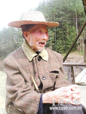 唱歌的老者坐在院壩前,滿頭白發,滿臉皺紋,手拿一根近1米長的煙桿,煙已熄,他沒發現。