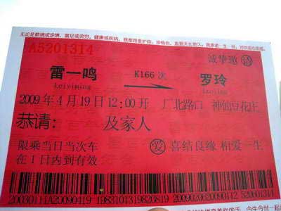 “太牛了,簡(jiǎn)直就是個(gè)牛人。”昨日中午11時(shí)多,在婚禮現(xiàn)場(chǎng),新郎的好友楊先生拿著明信片大小的“火車票”對(duì)記者說,原來來賓們手中所持的“火車票”都是結(jié)婚請(qǐng)柬,是由新郎雷一鳴自己設(shè)計(jì)的。