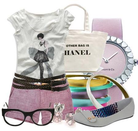 粉色短褲腰間扎上雙層鉚釘皮帶,搖滾風格的混搭。