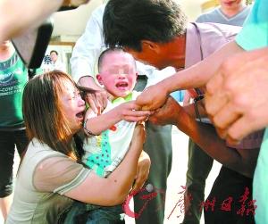 5月9日下午4時許,劉國琴緊緊抱著孩子,聲淚俱下。然而,9歲的小軍卻極力掙脫,哭著撲向養母的懷抱……“孩子乖,不哭,不哭。”養母安慰說,“這是你的親生媽媽。”